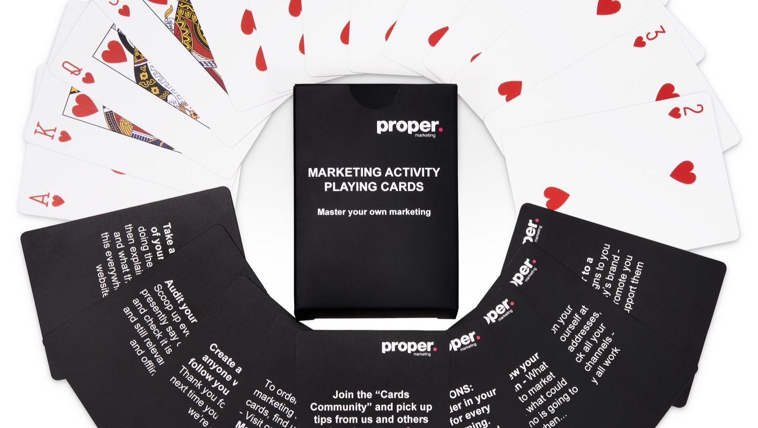 I’ve created a pack of 52 standard playing cards, each printed with a tried and tested marketing activity on the back that any business can carry out.
